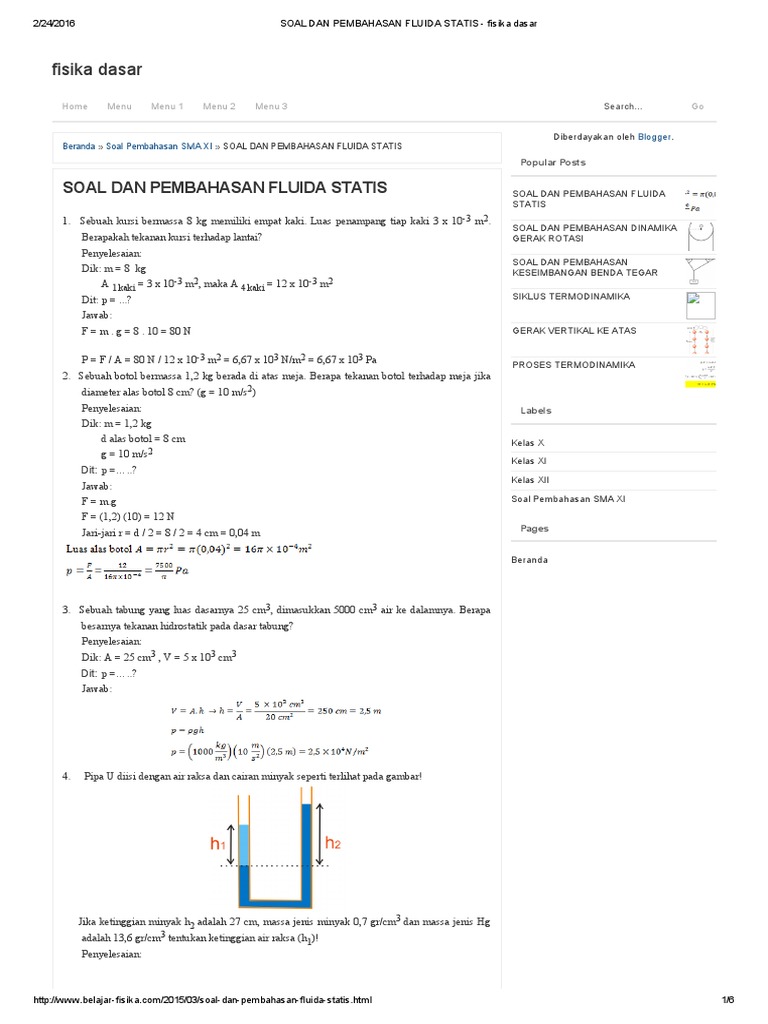Contoh Soal Fluida Statis / SOAL DAN PENYELESAIAN FLUIDA STATIS DAN DINAMIS~Contoh ... / Contoh soal dan pembahasan tentang fluida statis.. Contoh soal dan pembahasan fluida statis. Contoh soal dan pembahasan fluida statis. Dapat dilihat bahwa zat cair dalam bejana tersebut secara langsung atau tidak langsung tidak mengalami perpindahan. Sebuah ban mobil yang diisi udara dengan volume 0,1 m3 dan massa ban 1 kg untuk menjawab soal ini, kita harus pahami fenomena melayang, terapung dan tenggelam. Apakah bola tersebut bisa tenggelam atau kah akan mengapung ke permukaan air?